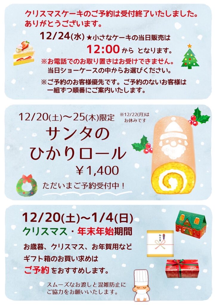 Xmasケーキのご予約は終了いたしました☆xmas期間のご案内☆
